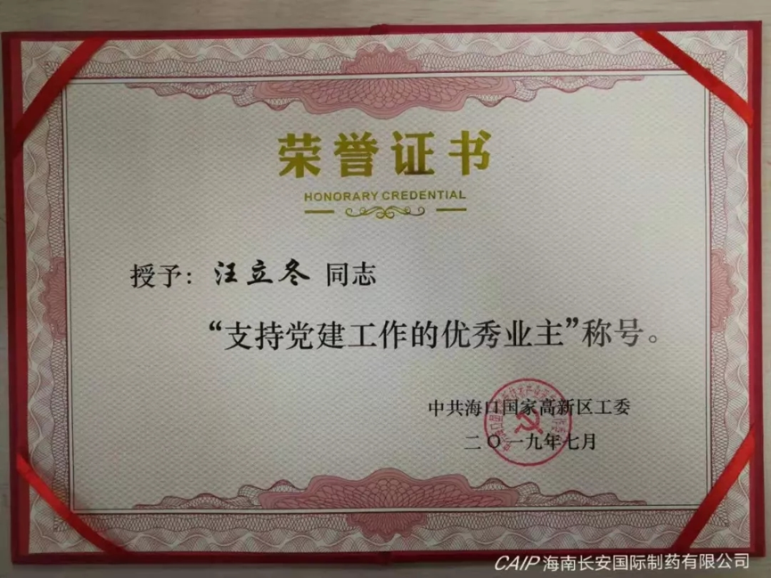 為表彰先進,弘揚正氣,中共海口國家高新區(qū)工委分別授予海南長安國際制藥有限公司黨支部書記汪立冬和黨支部委員陳麗娟“支持黨建工作的優(yōu)秀業(yè)主”和“優(yōu)秀黨務工作者”稱號。